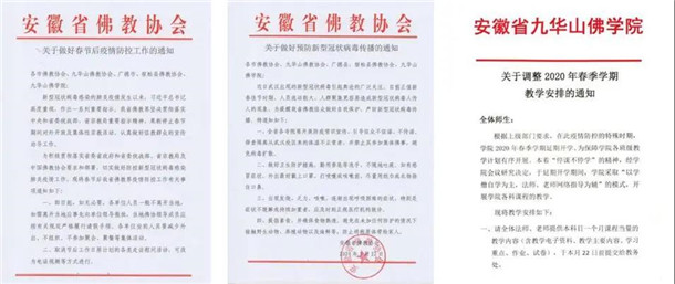 安徽省佛教协会积极加强防控工作,与省委统战部、省宗教局保持密切联系,对全省佛教界抗击疫情工作进展情况实行专报。全省佛教界严格执行“两暂停一延期”防控要求,认真落实好各项防控措施:寺院一律暂时关闭,暂停集体宗教活动,九华山佛学院延期开学,加强教职人员管理,严禁人员聚集、严禁集体用餐,确保人员安全,并做好信教群众的疏导工作,有效避免了春节期间人流聚集。同时,做好清洁卫生和消毒工作,坚决防止疫情蔓延到宗教活动场所、教职人员等。各地佛教协会、寺院实行公共区域消毒、进门测体温、出门戴口罩、分餐分食等措施,安排专人值班,加强督查检查,认真做好相关情况统计和报告工作。九华山佛学院发布《紧急通知》《关于调整2020年春季学期教学安排的通知》,落实封闭管理措施,严禁校外无关人员进入,留校师生无特殊情况不得外出,做好体温检测、卫生防护、定期消毒,确保疫情防控措施无死角、全覆盖,妥善做好留校学生的相关工作,安排好生活,帮助解决实际困难,解除后顾之忧。同时,为减少因疫情延迟开学对正常教学的影响,利用国家开放大学数字化学习资源中心等免费平台,指导学生开展在线资料阅读、公共课教学等学习活动。