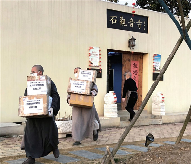 武汉石观音寺僧人搬运寺院捐助给当地医院的医疗物资