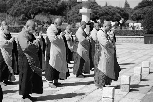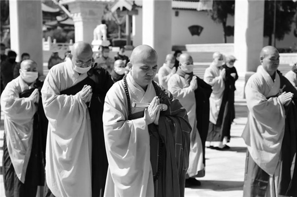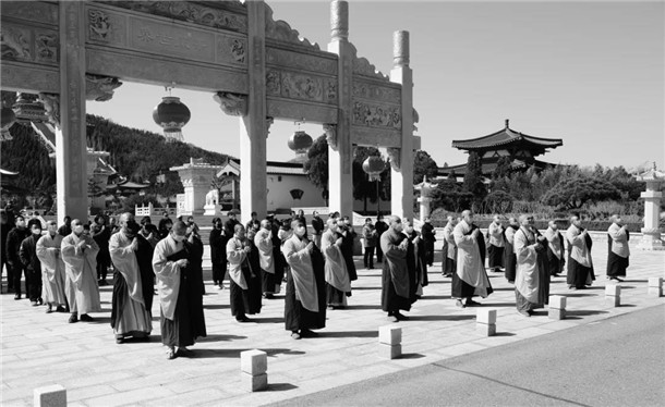 仪式由山东省佛教协会副会长、烟台市佛教协会会长、南山禅寺方丈真龙法师主持,带领南山禅寺全体僧众于华严世界北门举行此次默哀仪式。