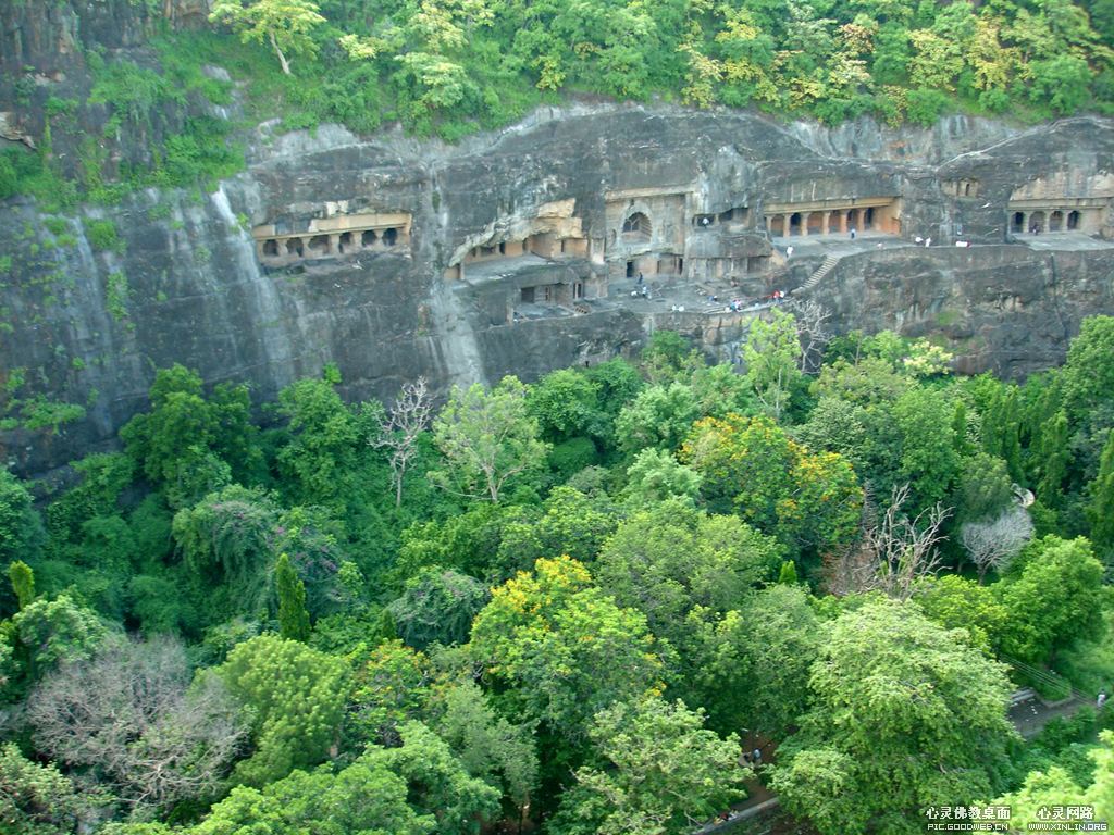 阿旃陀石窟位于印度马哈拉斯特拉邦北部文达雅山的悬崖上,西距奥兰加巴德 106 公里。石窟环布在新月形的山腰陡崖上,高低错落,绵延 550 多米。以壮丽的建筑、精美的雕刻和壁画,与泰姬陵并称为印度的双壁,是著名的佛教圣地,南印度最著名景点之一。