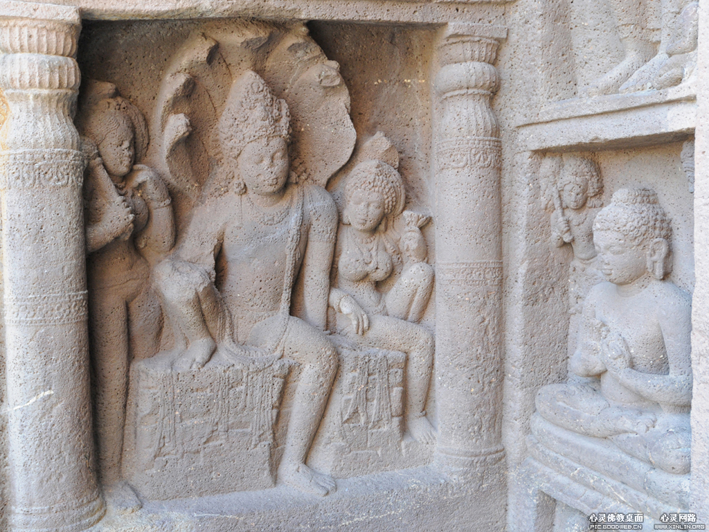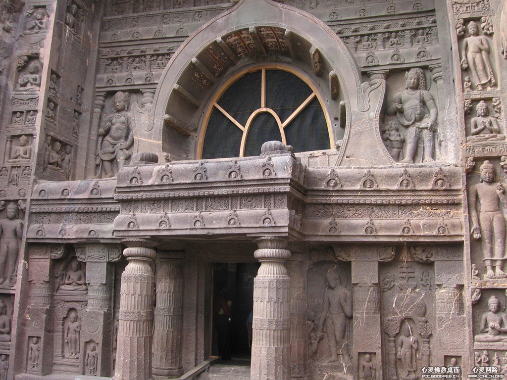 阿旃陀中期——佛教文化艺术的发展时期所建的几座佛殿。殿门十分宏伟。门洞上方是一条前突的门楣,由两根圆柱支撑。门楣上方有一个大的半圆形窗,能为洞窟内采光。窗两侧雕有两尊金刚力士的浮雕像,还有各式小佛像和佛经故事人物雕像。