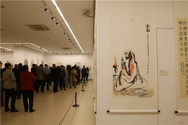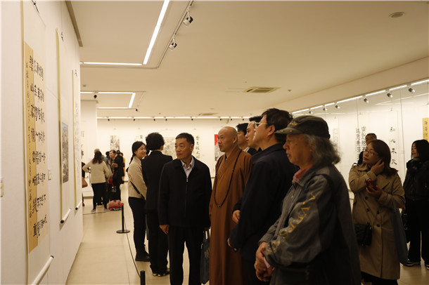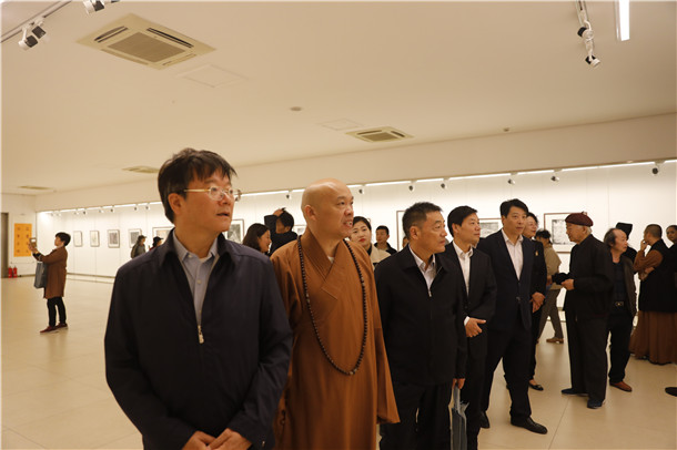 在欢快的音乐声中,由省佛教协会副会长、徐州市佛教协会会长、兴化寺方丈果光法师引领下,参加开幕式的各位领导、贵宾、嘉宾和群众,缓步走进展厅,参观这些德艺双馨的艺术家的书画作品。