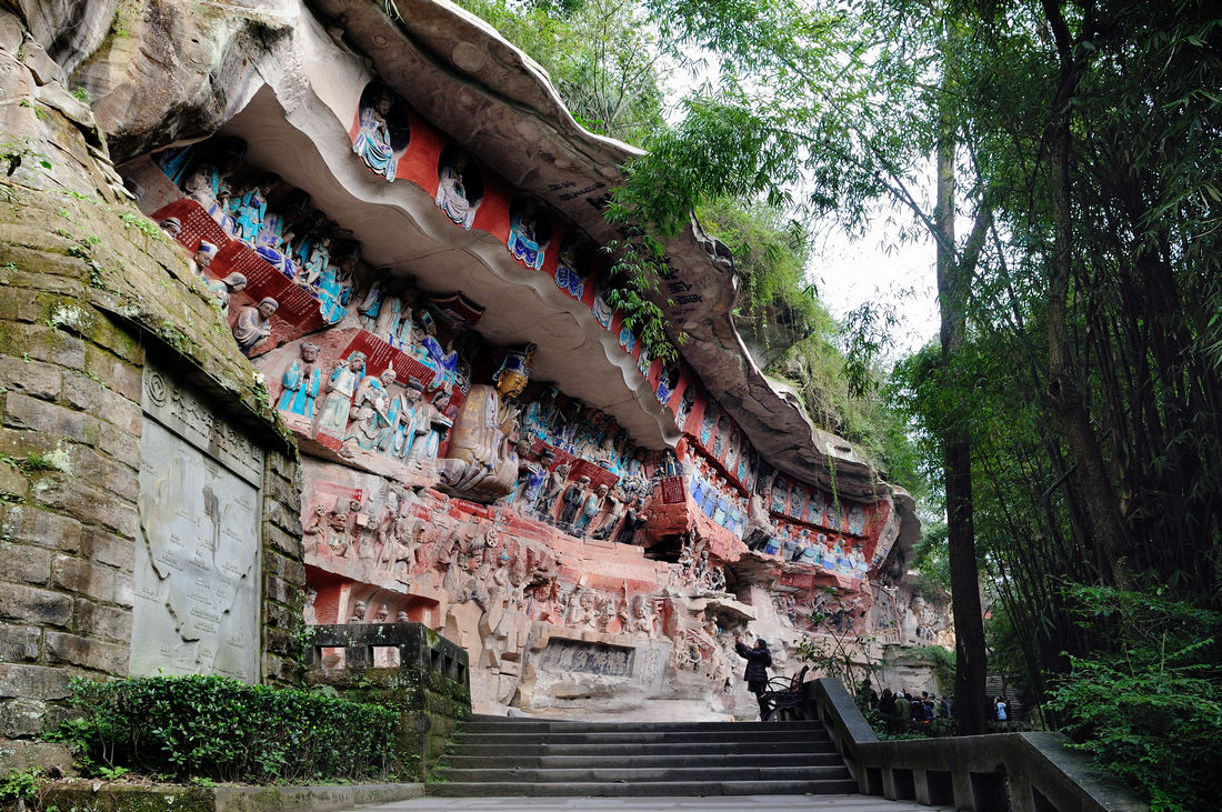 重庆大足石刻位于中国直辖市重庆大足区境内,距重庆主城九区167公里,有74处5万余尊宗教石刻造像。它是唐末、宋初时期的宗教摩崖石刻,以佛教题材为主,儒、道教造像并陈,尤以北山摩崖造像和宝顶山摩崖造像为著。北山摩崖造像位于重庆市大足区城北1.5公里的北山。北山摩崖造像长约三百多米,是全国重点文物保护单位、世界文化遗产。 大足石刻群有石刻造像70多处,总计10万多躯,其中以宝顶山和北山摩崖石刻最为著名,其以佛教造像为主,是中国晚期石窟造像艺术的典范。与敦煌莫高窟、云冈石窟、龙门石窟、麦积山石窟等中国四大石窟齐名,体现了古代汉族劳动人民的卓越才能和艺术创造力。