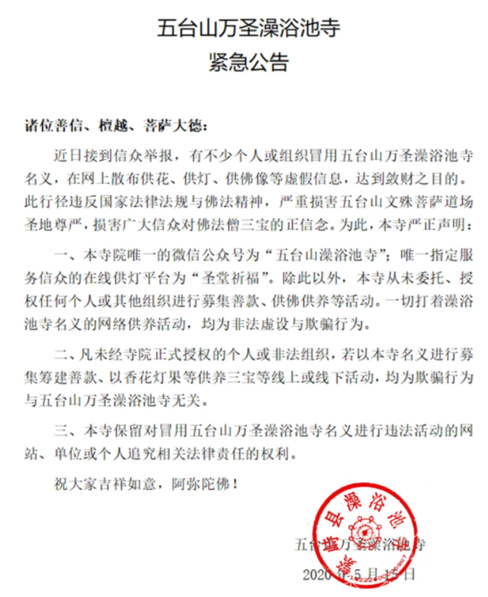 五台山万圣澡浴池寺紧急公告:本寺未委托任何组织或个人进行募款、供佛供养