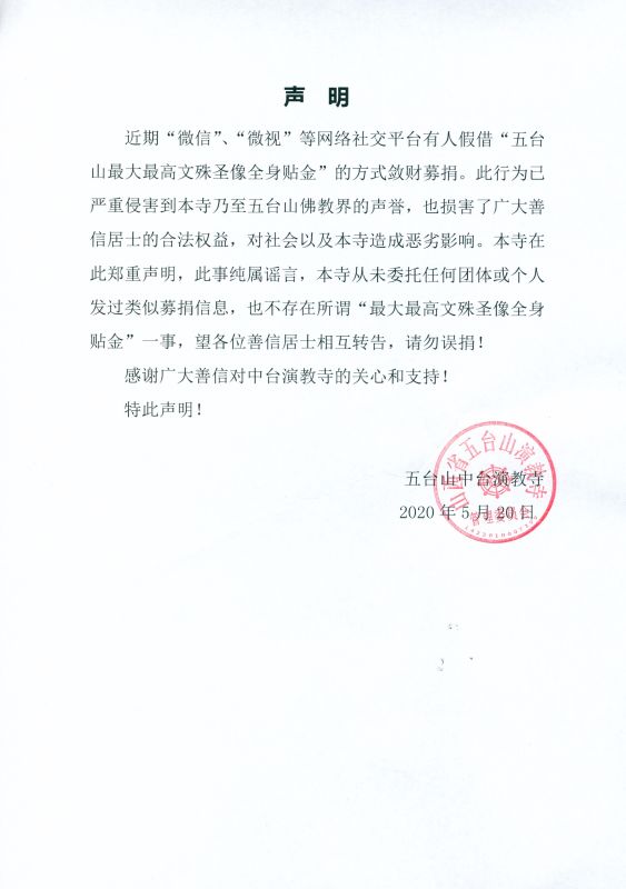 近期“微信”、“微视”等网络社交平台有人假借“五台山最大最高文殊圣像全身贴金”的方式敛财募捐。此行为已严重侵害到本寺乃至五台山佛教界的声誉,也损害了广大善信居士的合法权益,对社会以及本寺造成恶劣影响。本寺在此郑重声明,此事纯属谣言,本寺从未委托任何团体或个人发过类似募捐信息,也不存在所谓“最大最高文殊圣像全身贴金”一事,望各位善信居士相互转告,请勿误捐!