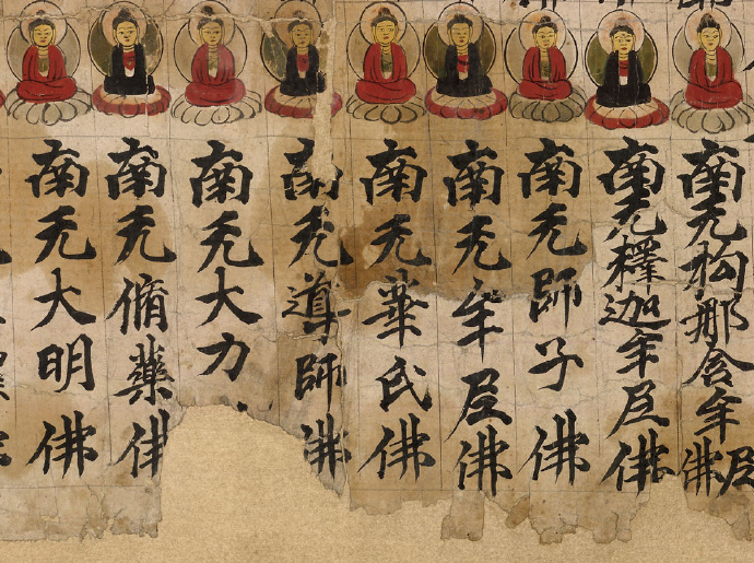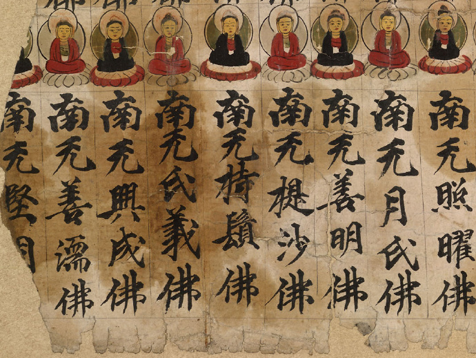 一名号一莲花一佛像,虔诚恭敬一心供养,历时一千多年,虽已残缺不全,但色彩依旧亮丽鲜艳,此是五代时期写卷,同样的写卷斯坦因还收集有2卷,分别存放在大英博物馆和大英图书馆。法国人伯希和也收集有相似的写卷,收藏在法国国家图书馆内,伯希和的敦煌遗书是八世纪唐代写卷,所绘佛像似乎更精细,保存的也相对较为完整。隆日博客将在此与您一一分享敦煌千年国宝,敬请期待!