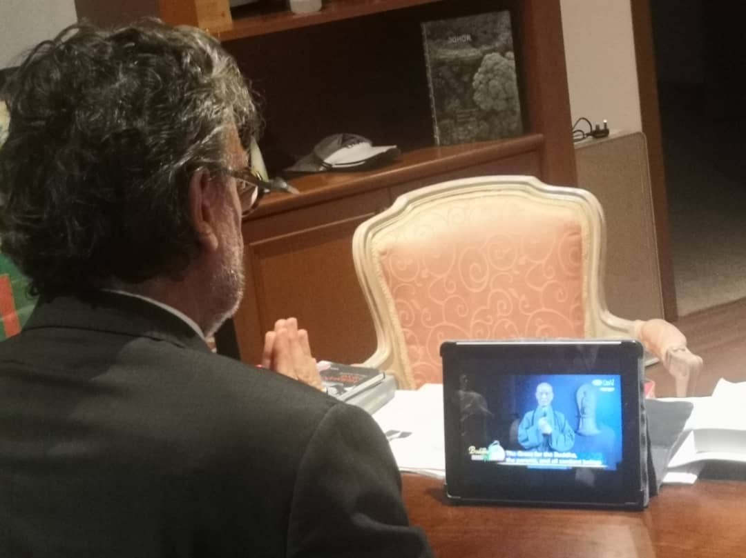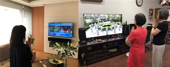 台湾时间早上7点全球各地线上浴佛祈福,在美洲部分国家是晚上7点,在欧洲、非洲国家则是凌晨1点,54个国家和地区慈济志工尽管无法到慈济会所,甚至无法出门,透过电视转播、行动装置连线祈祷。