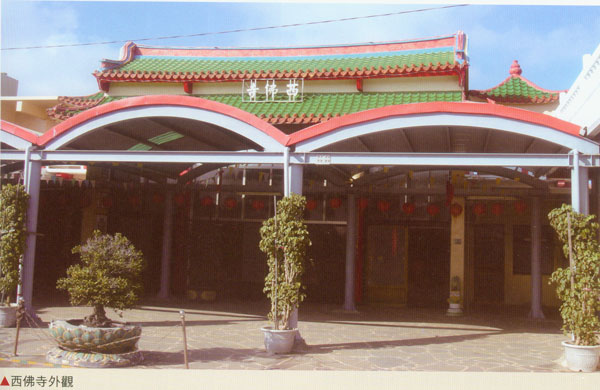 西佛寺造型设计简单,平直的红色屋脊,绿色屋瓦,米黄色寺墙。左右厢房为平房,以供会议室、经书摆放、信众休息处。大殿供奉三宝佛,前置观音菩萨,大殿范围适中,简单的佛菩萨、法器配饰,另有一份清静、安适情境。