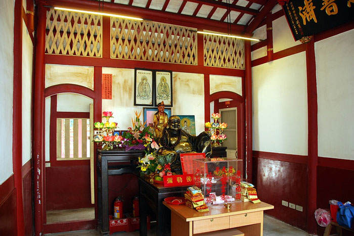 第二进正殿前檐柱同前后檐,为民国三十八年已丑新作洗石子龙柱。室内大木结构由大到小,共十一架,大小制作考究。中央供奉观音菩萨及弥勒佛,左右配祀十八罗汉,左次间奉五谷先帝、盘古大帝、福德正神,右次间祀注生娘娘、婆姐二名。左耳房供奉神农大帝、佛祖。右耳房祭祀地藏菩萨及觉丰蝉师的莲位。通往左右护龙的山门,左右门框上刻“登觉路”、“入玄门”。护龙为简洁的穿斗式结构,除作为厢房使用外,左右各祀文殊普贤菩。资料来源:“台湾大百科全书”网站