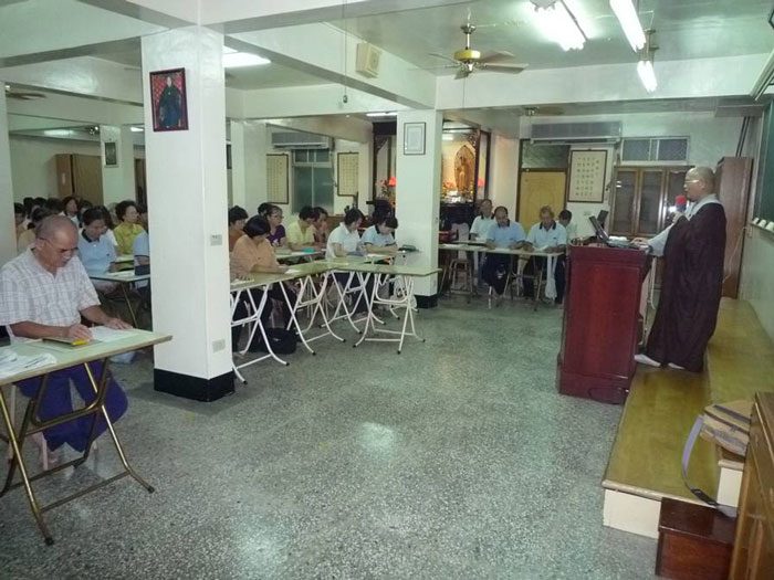 板桥讲堂位于四楼,占地约八百坪,大殿内供奉丈六卧佛,前列两旁供奉五方佛、护法韦驮、供养菩萨;绕廊并设有办公室、会议室、电脑室、图书室、流通处、斋堂等现代设备。