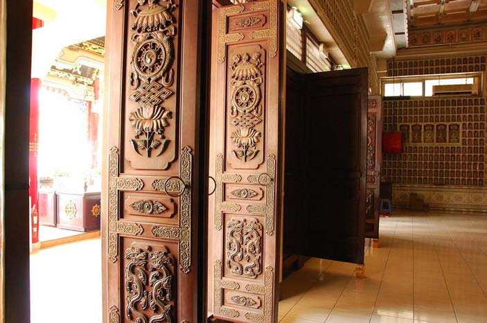 慈善寺采黄瓦、红柱、白墙栏的建筑色彩。走进三开间山门後,右方是2层楼.单殿双护龙的大雄宝殿,黄瓦屋脊上有铜饰“法轮常转”,拾阶而上,殿前有韦驮、伽蓝护法立於两旁,大殿供奉华严三圣。右护龙为地藏殿,左护龙为观音殿。寺院左方另有2层建筑,2楼为弥勒殿,1楼作为寺务处。中庭後有1楼高5层之华藏塔,塔右建有“律航纪念堂”。塔前左方庭院建有怀思碑亭,亭中安置振光法师铜像,栩栩如生。
