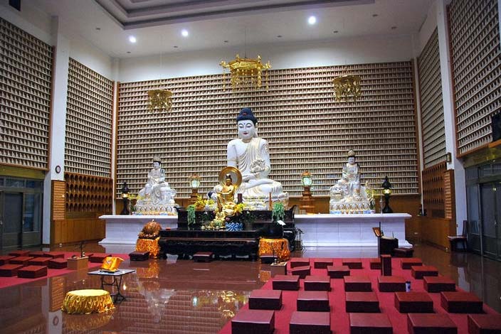 中央为仿唐式重檐庑殿,供奉释迦牟尼佛:左右两侧各有3层楼建筑,作为寮房、大寮等之用。