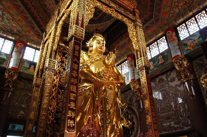 【文殊菩萨】司一切如来之智慧,又名智慧佛,与普贤菩萨同侍释迦牟尼佛,世称“华严三圣”。文殊菩萨是释迦牟尼佛众菩萨弟子中的上首,智慧、辩才第一,象征佛陀智慧的菩萨,称“大智”。在中国,他和观音“大悲”、地藏“大愿”、普贤“大行”并称四大愿菩萨。文殊菩萨外形多为顶结五髻(代表大日如来的五智)、手持宝剑(表示智慧之利)、坐骑为一狮子(表示智慧的威猛)形。手中持物右为智慧焰剑,左为莲华上之般若经典,象征文殊菩萨的智慧出如利剑,可摧毁愚痴,般若智慧浩瀚如经卷。