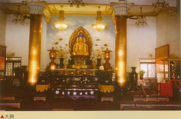 属北方唐氏建筑,没有繁复重檐、华丽西施脊,仅一法轮立於黄金琉璃瓦屋脊上,以表法轮常转,更显佛寺庄严肃穆。前庭宽广,竹木围篱,花木扶疏。大雄宝殿为挑高花岗岩建筑,三川式落地喷砂玻璃门,偌大殿堂,独2支珐琅包金点金柱,没有画梁雕栋,只有顶上绘彩莲花,12