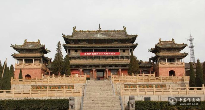 第二院正殿为大雄宝殿,东、西各有廊房七间。大雄宝殿规模宏大,气势非凡。殿面宽五间,进深八架椽,单檐悬山顶,琉璃剪边,于宏壮中颇见精巧。 殿内原有明正德十五年所塑的三尊佛像,皆身高丈余,金装莲座,仪态丰满,壮观非常。然像已毁于解放初期;大雄宝殿门旁的石柱上有两副耐人寻味的楹联:其 一:白云缭绕度苍松总是千般幻影,明月婆裟辉宝座传来一盏孤灯;其二:一念自能归正觉,万方谁得见如来;门枋上彩绘着18副西游记的故事。殿内供奉着横三 世佛,即释迦牟尼佛,药师佛,阿弥陀佛的金身坐像和迦叶、阿难的立像。东西两侧有16尊者塑像,神态各异,颇具动感。