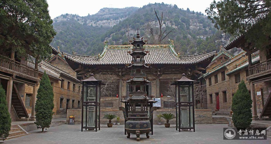寺院前面是一个坪台,坪台东西建有对称的两座阁楼,西阁门洞前还有两只唐代石 狮,古朴可爱。坪台之后是天王殿兼山门,两侧各有掖门,左右是高达三层的钟楼、鼓楼。 从掖门入寺,主寺是两进院落,西有偏院,东部高台上有楼阁,西北崖上还有佛殿,随山就势,总体布局风格独特。不过没有完整地保存下来,寺院内保留至今的有 几座很有价值的古建筑。