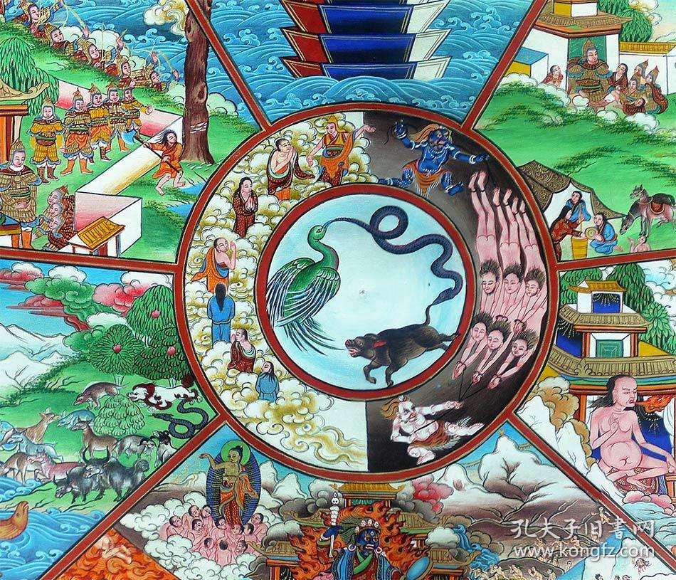 《六道轮回图》又名《生死之轮图》、《生死流转图》、《因果报应图》等,系凡夫众生在六道中生死、轮回的图解。这幅图结构严谨,寓意丰富、深刻,其用途不在于禅修观想,而是为了帮助观画者理解六道轮回、十二因缘等教法。