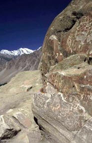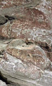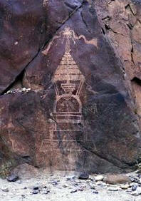这是一幅以佛塔为图案的岩画。巴基斯坦的山区小镇吉拉斯素以古老岩画而闻名。从首都伊斯兰堡出发,沿着印度河驱车北行约420公里,就可以到达“吉拉斯一期”岩画遗址。在河岸两旁一块块黝黑而光滑的岩石上,当地先民通过简朴的岩画为我们遗留下了早期人类社会广阔的生活风貌。由于被刻画在巨大的岩石上,吉拉斯岩画至今仍然静静地躺在印度河岸边等待人们的观赏。它就象一座露天的博物馆,无时无刻不在向来往的人们讲述着印度河文明悠久的历史