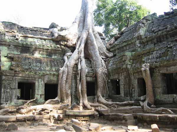 由于舍弃了神山式的结构,这里就成了热带雨林的天下:如蟒蛇般的树根,爬满塔布茏寺里里外外,深入建筑中。寺内倒塌了的石塔和围墙这一堆那一堆,挺身而立的大树东一棵西一棵,使原来规矩的寺院成了迷宫。这奇特的景观形成于自然与人文的完美结合。