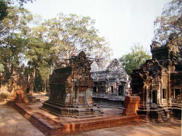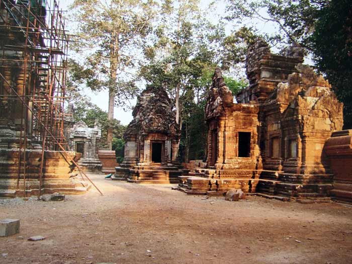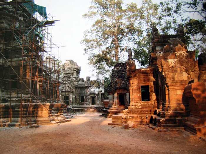这里需要特别提出的是,吴哥古迹从19世纪被重新发现后,即已着手进行了艰苦卓绝的维修保护工作。各国专家在漫长的吴哥古迹维修中创造了许多好的维修方法,比如“类风格修复法”就很好。而从各国维修吴哥古迹的作法来看,对建筑物毁灭部分的修复都是很慎重的。绝大多数采取的是局部修复方法。也可以说是“知道多少修复多少”的方法。比如癞王平台,两个时期修建的石雕台座都进行了全面修复,但对台上的建筑则采取遗址保护的作法,没有复原重建。对神牛庙和克拉弯砖石塔的维修,也仅对基座和塔身毁坏的部分进行了局部的修复,而对缺乏修复依据的塔顶部分则采取了保持现状的作法。但是按“遗址保护”原则维修的古建筑也不排除局部的修复,比如巴芳寺东入口塔门和吴哥城南门外的几座古塔,基本上属于“遗址保护”的范畴,但是这些建筑的基座部分都进行了修复,只是墙体和屋顶部分没有进行修复,保持残垣断壁的状态。