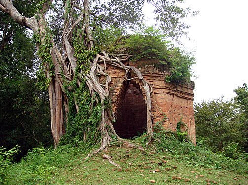 这个公元7世纪真腊的首都当时叫伊赏那补罗城(Isanapura),现在这里点缀着一些古迹和留下的弹坑。保存最好的建筑物要数Prasat Yeay Peau寺,一棵古树像蟒蛇捕食一样地扼住其东门。
