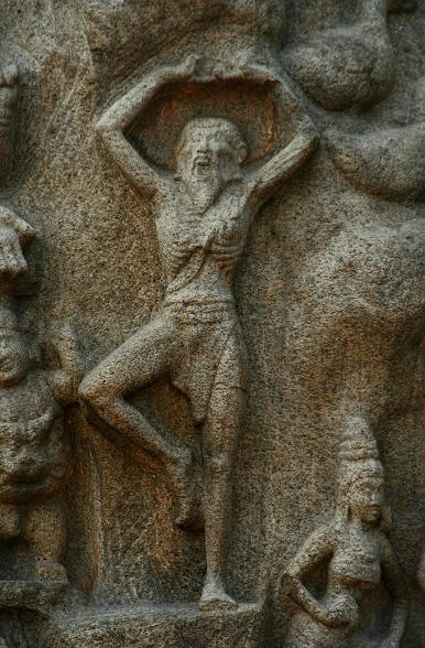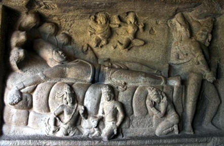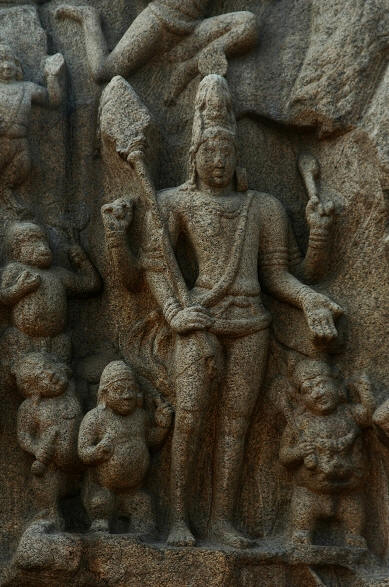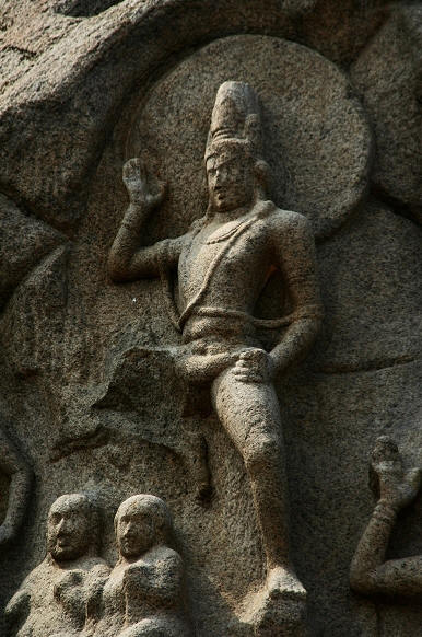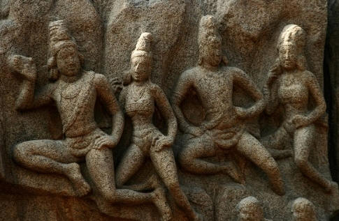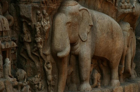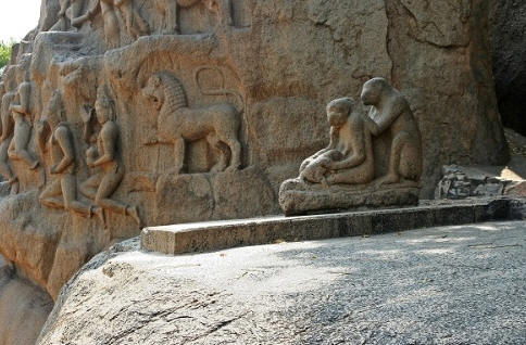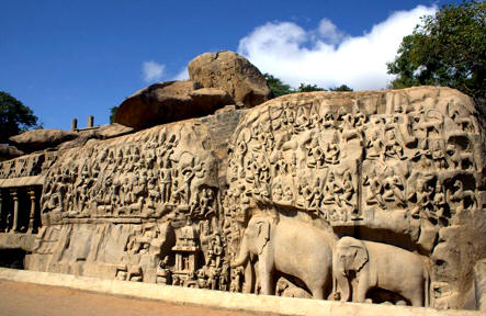 该城过去曾是海港,曾发现过中国、波斯和罗马的古币。马哈巴利普拉姆建筑是7至8世纪期间,帕那瓦国王们沿着科罗曼德尔海岸开辟岩石而建的。其中特别著名的有战车形式的庙宇,名为“恒河的起源”的巨大露天浮雕和里瓦治寺院。马哈巴利普拉姆浮雕凿刻在海边两块高达60米的巨岩上,讲的是与《罗摩衍那》并称为印度两大史诗的《摩柯婆罗多》中的英雄阿朱那的故事。有形象生动的神灵、魔鬼和动物的图像100多幅。建筑物上数以千计的雕刻表现信徒们对湿婆神的崇拜。沿海岸线布满了令人眼花缭乱的鹅卵石,形成了奇特的鹅卵石风景线。