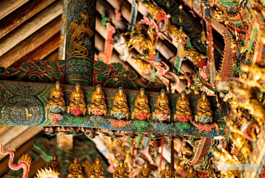 千佛庵大雄宝殿内,满堂木骨泥质悬塑艺术颇具特色,堪称中国悬塑艺术之“绝唱”。全省明清时期彩塑作品的4%以上,都留存于这个只有169.6平方米的殿堂内。