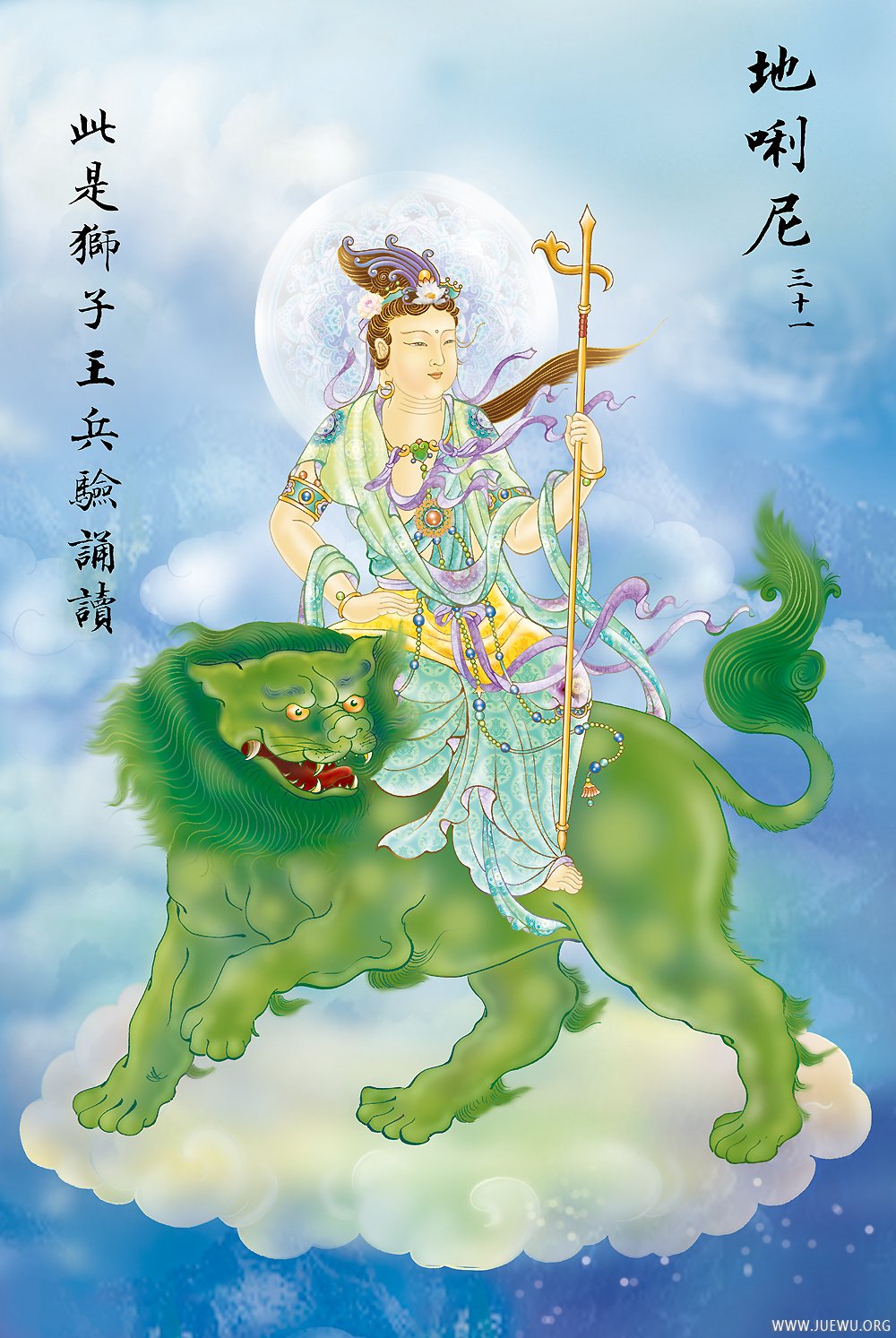 (15)不为非分自害死。诵此陀罗尼者,世间八万四千种病,悉皆治之。若在山野诵经坐禅,如有山精魑魅鬼神恼乱,诵此咒一遍,诸鬼魔悉皆被缚。如法诵持者,观音菩萨,一切善神,金刚密迹,常随护卫,不离其侧。