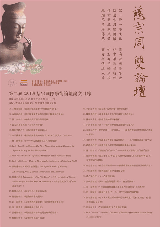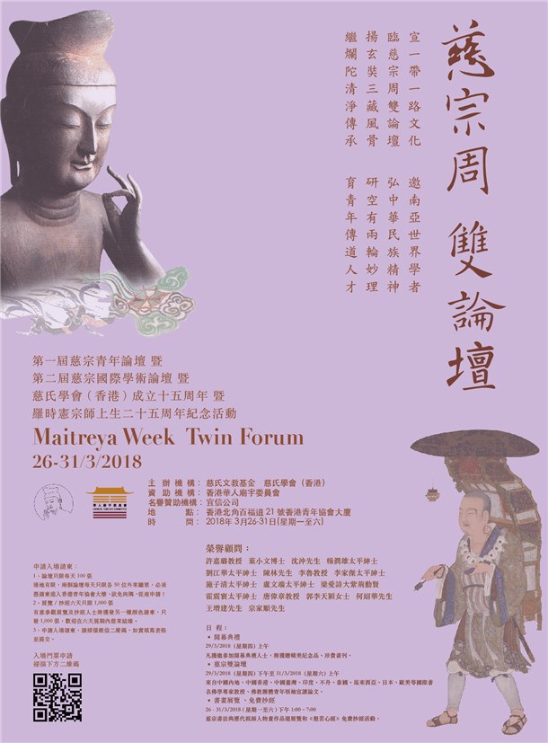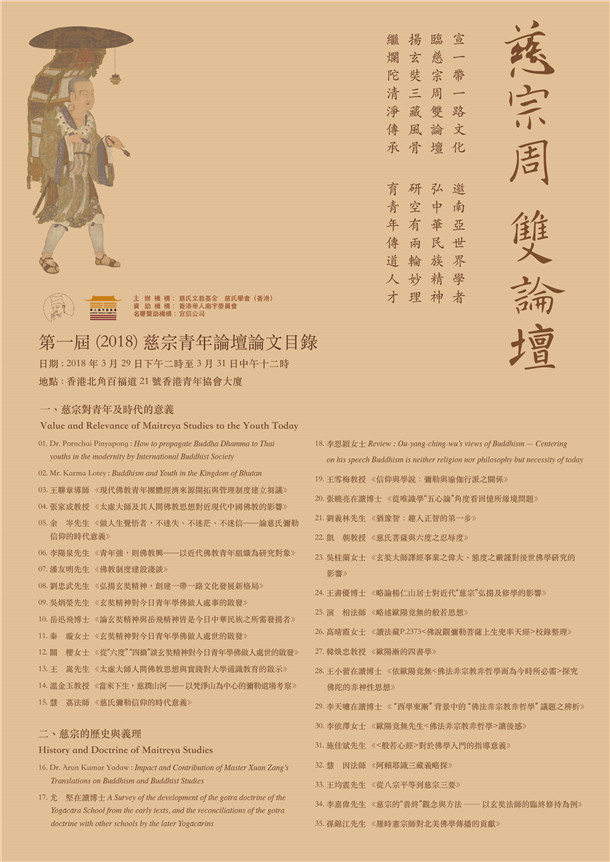 觉悟佛教网香港讯 2018年3月,为庆祝慈氏学会(香港)成立十五周年暨罗时宪宗师上生二十五周年,慈氏学会(香港)慈氏文教基金将于香港北角青年协会大厦举办第一届慈宗青年论坛暨第二届慈宗国际学术论坛。广邀中国内地、中国香港、中国台湾、印度、斯里兰卡、不丹、泰国、马来西亚、日本、欧美等国际著名专家教授、佛教团体青年领袖精英齐集一堂,交流一带一路文化,弘扬玄奘精神与风骨,传播中华文化之精粹,共同探讨弘扬慈氏之学。欢迎各界友好学人随喜参听,共结胜缘。