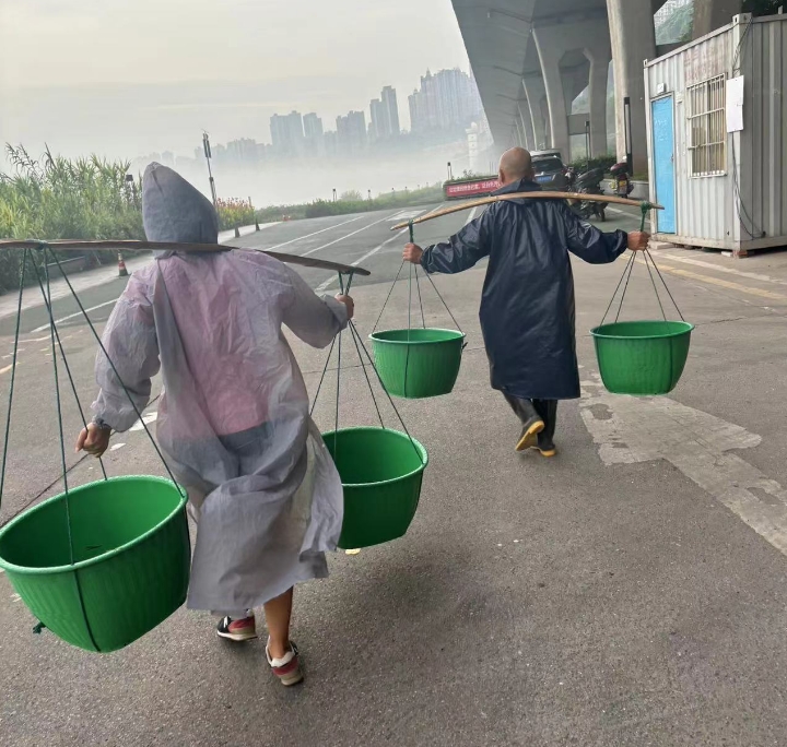 由于车不能直接开到河边,只能靠人力搬运过去。