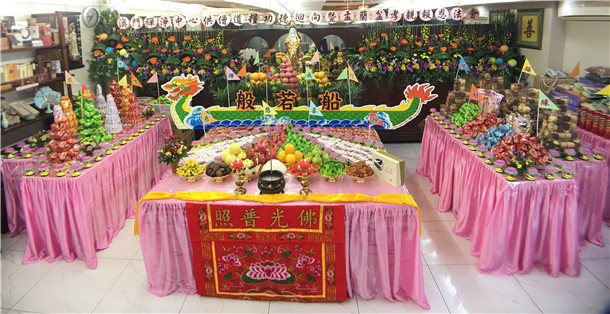 庄严的赞普台以佛光四句偈为主题,五果百味等种种上好供品,呈现“慈悲喜舍”、“惜福结缘”、“禅净戒行”、“惭愧感恩”、“佛光普照”的景象,如果人人能依教奉行,并以般若为引导,必能净土现前。法会圆满,常住把加持过的供品,分享给与会信众,让大众共同感受“佛欢喜日”的法喜。