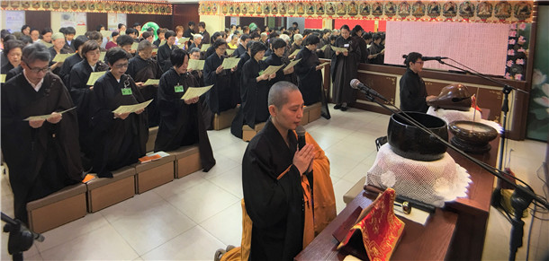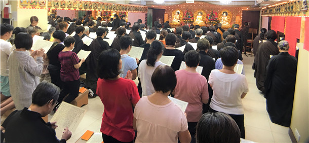 早上10点,法会由住持觉仁法师主法,法师为赞普台洒净,大众虔诚恭诵大悲咒,祈愿三宝龙天应感垂降坛场受供,更愿三宝俯垂证鉴,把一整年供僧的功德,回向给累世父母、历代祖先,速离恶趣,自在化生,受无量乐;亦回向给现世父母,自身眷属诸事吉祥,福乐延绵。信众在法师带领下,全神贯注地跪诵【佛说盂兰盆经】,以共修的清净功德报答父母辛劳长养之恩,法师领众恭诵 【报父母恩咒】,绵密的报父母恩咒音声,回向现世父母及七世父母,愿父母现存者福慧无量,往者永断三涂,受胜妙乐。