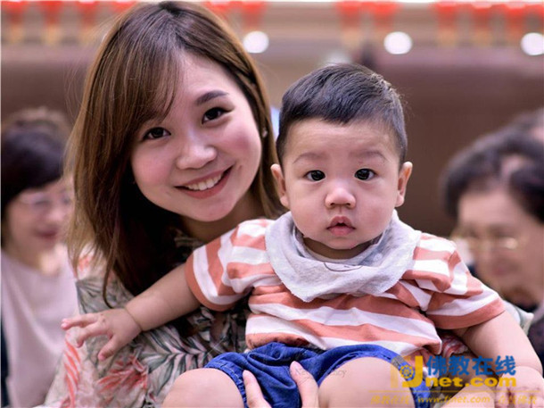 “成为新手妈妈有点紧张,但觉得很幸运,小宝宝刚出生就能接受佛菩萨祝福,全家都非常欢喜!”初为人母的敖钰崇,怀抱刚满月的小婴儿与会,成为此次年纪最小的佛光宝宝,因为外婆是虔诚的佛教徒,宝宝尚未出生前,即时常为她念佛祈福,宝宝出生后,每当啼哭时,就播放有观世音菩萨圣号的音乐给宝宝听,从小灌溉法水、培植佛种,一家三代因佛法的滋润,而感到幸福满满。