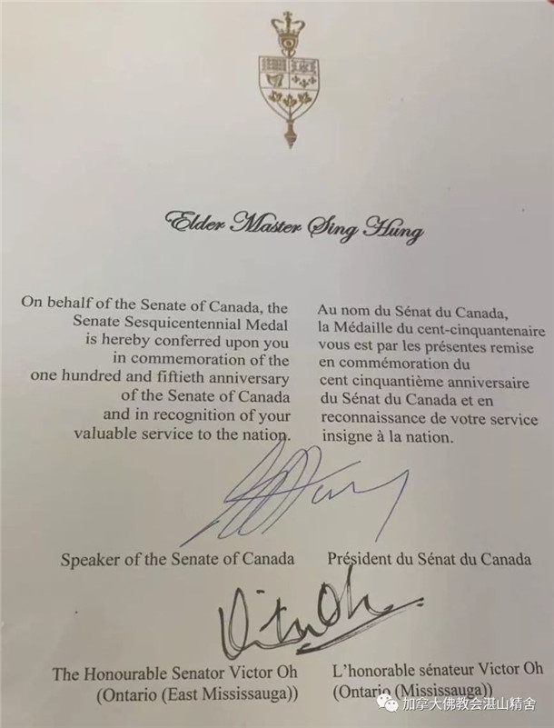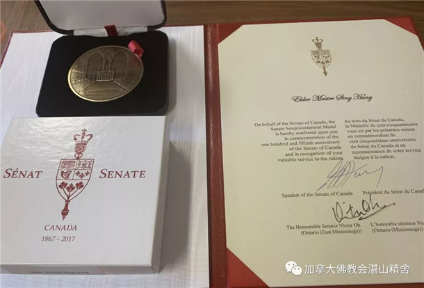 觉悟佛教网海外讯 近日,湛山精舍收到一个特大喜讯,湛山精舍开山宗长性空长老荣获加拿大建国150周年荣誉勋章。加拿大国会上议院议长George Furey专门向性空长老发出贺信,充分彰显了意义重大的无上殊荣。