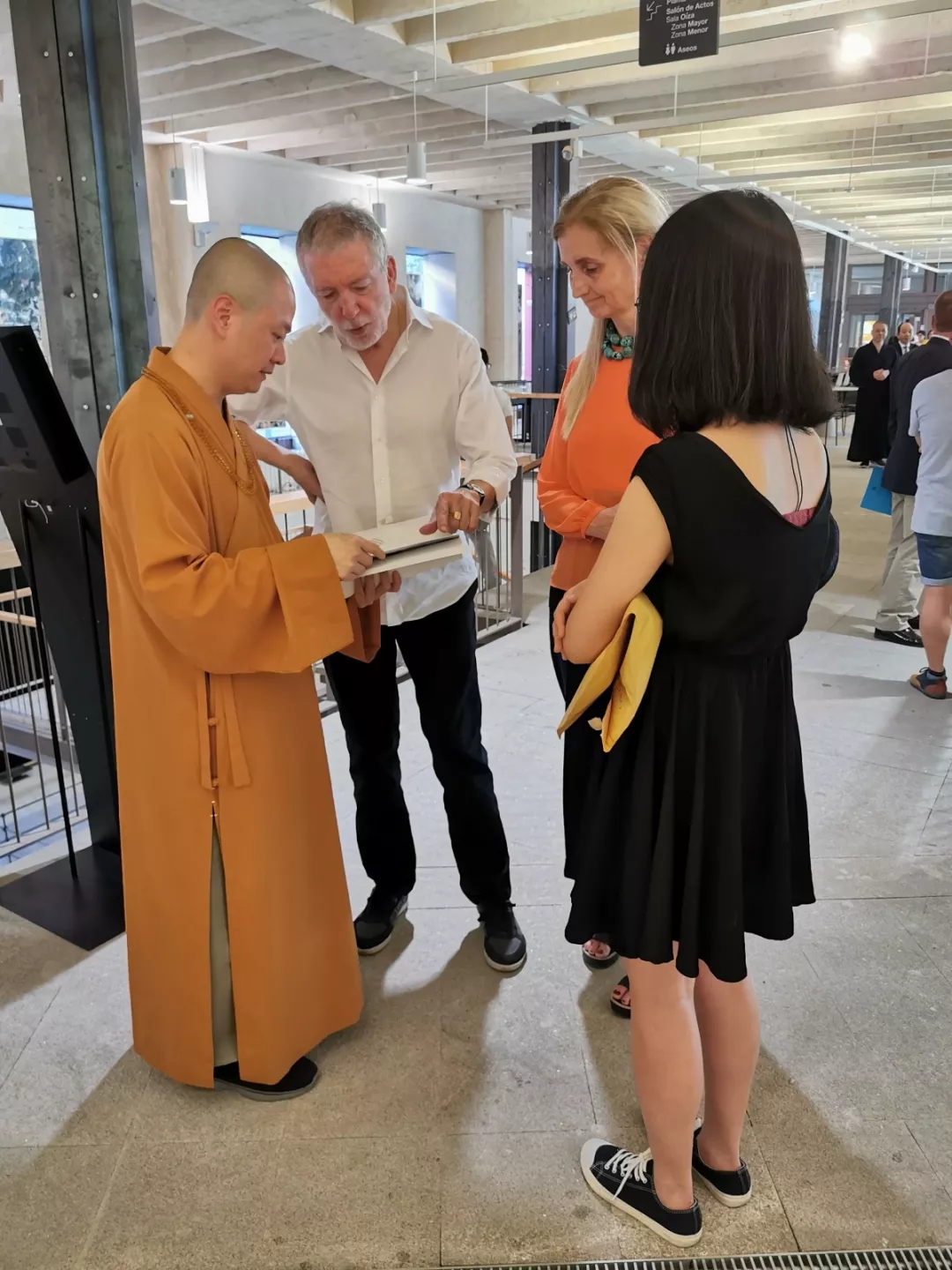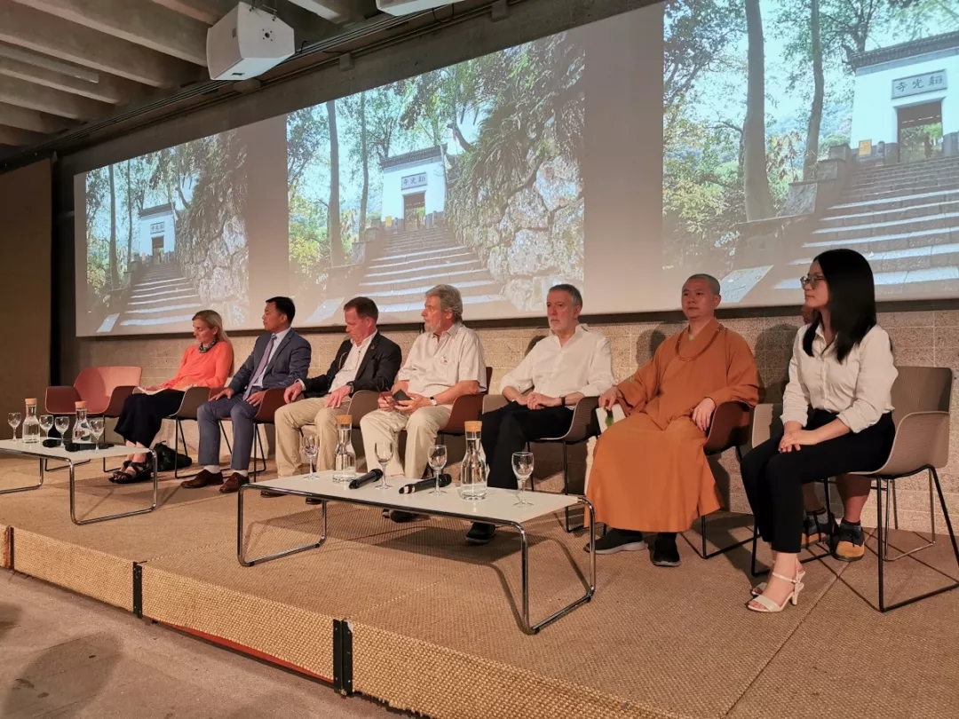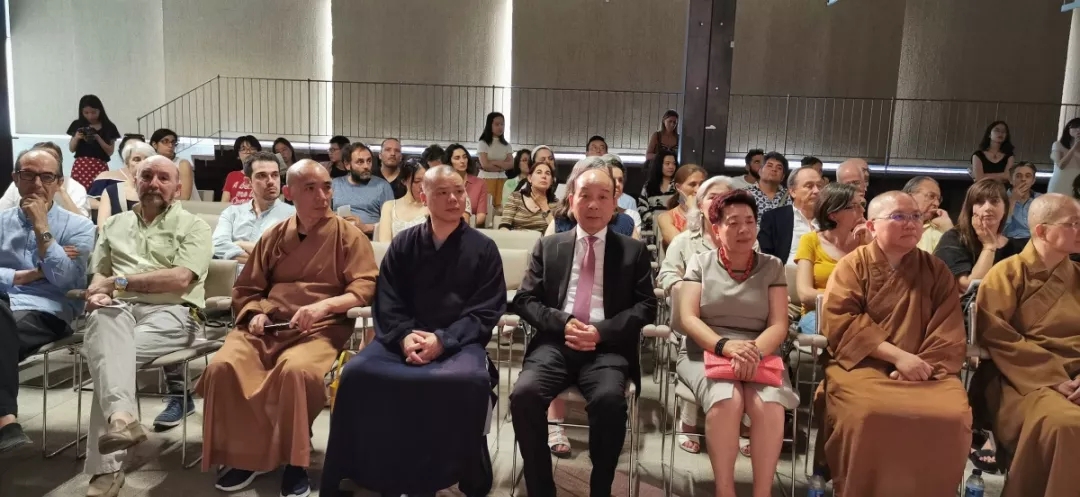 开幕式由马德里建筑师官方协会发言人Mercedes Díez 主持。马德里建筑师官方协会秘书Maria Anton Barco致欢迎词,她首先感谢主办方马德里理工大学、同济大学和浙东佛教文化研究院,以及承办方七塔禅寺对展览的大力支持,同时对远道而来的可祥法师、界义法师和定光法师表示诚挚的欢迎与感谢;西班牙华人华侨协会会长毛峰指出,佛寺建筑的展出有助于中西文化交流和中西经贸往来,推动“一带一路”文化交流向广度和深度发展;马德里理工大学副校长Fco. Javier Jiménez Leube对展览内容给予高度评价,对展览的圆满举办表示庆祝;马德里理工大学前副校长Angel Alvarez 感慨道:近20年来,中国经济社会等方面发展取得的成就令人赞叹,对中国传统佛寺文化走进西班牙表示大力支持;马德里理工大学荣誉退休教授、西班牙著名建筑师José Ignacio Linazasoro对中国佛寺空间之美表示高度赞叹和肯定;浙东佛教文化研究院院长可祥法师在发言中指出,中国汉传佛教寺院建筑脱胎于中国古代的宫殿、贵族府第,以及行政衙署建筑,是中国传统建筑的重要组成部分,它是中国古代劳动人民智慧的结晶,是我们为之骄傲的、辉煌的艺术遗产。在漫长的中国佛教史上,汉传佛教寺院在佛教自身发展与促进中国传统文化发展和社会教育等方面,都发挥着重要的功能作用;此次展览的策展人、展出作品主要设计人王伟侨向各方致以感谢,并介绍展览的缘起、展览工作团队、佛教圣迹数据库(www.buddhist.wiki) 的建设及预期发展情况。