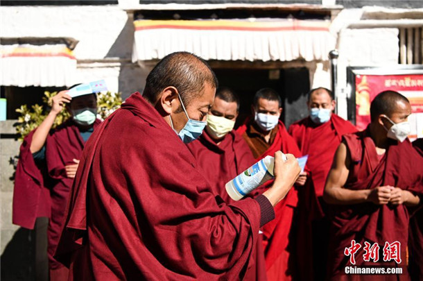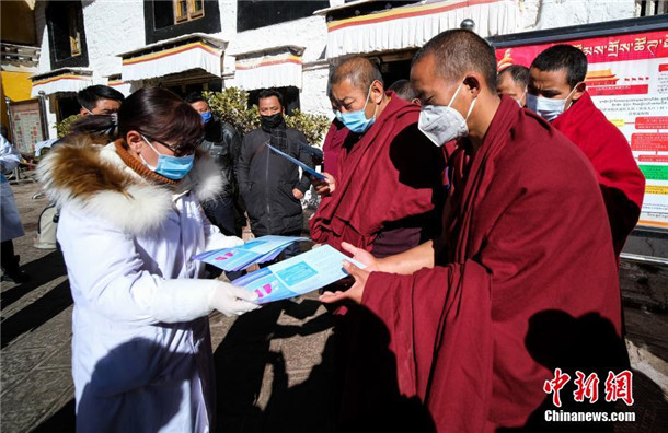 图为西藏自治区疾控中心工作人员为大昭寺僧人发放新型冠状病毒感染肺炎健康科普知识宣传册。何蓬磊 摄