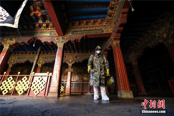 图为西藏自治区疾控中心专业人员对大昭寺进行消毒。 何蓬磊 摄