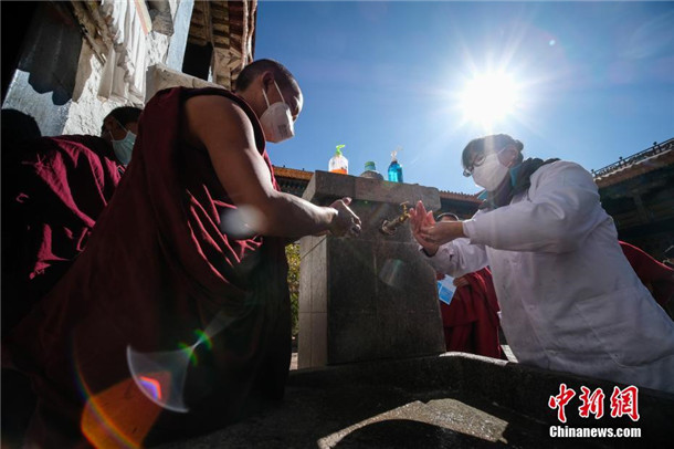 图为大昭寺僧职人员学习消毒液使用方法。 何蓬磊 摄
