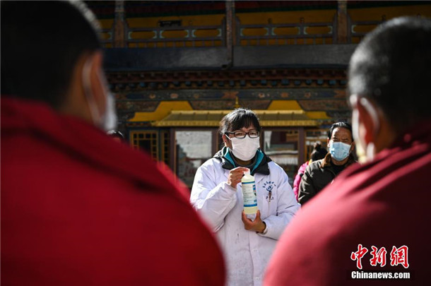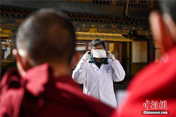 图为西藏自治区疾控中心卫生监测所所长普布卓玛为大昭寺僧职人员现场示范讲解戴口罩的方法。 何蓬磊 摄