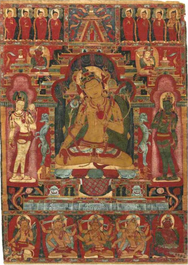十三世纪 西藏绘画 棉地矿物颜料 黄金 尺寸:46.8×39.6 cm 文殊菩萨头戴宝冠、发髻高束、发绺披肩,面庞圆润、神情安详。佩耳珰、项圈璎珞、臂钏、手镯、足钏及披帛等饰品严饰全身。右手膝前结施与印、左手当胸施印,双手各拈一株莲茎,呈金刚跏趺座安住在莲座之上。 法座左侧是白色的观世音菩萨,右侧是绿色的金刚手菩萨。画面上方中央塔门内是释迦牟尼佛,两侧为过去七佛,最右侧的可能是未来弥勒佛,七佛下方两侧为红文殊和白文殊菩萨。画面最下方一排为五文殊菩萨坐像。